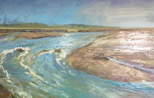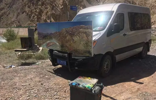 进入甘肃境内的油画写生,是在天水市的一个峡谷里,当时感觉是甘肃省的植被和水资源相当不错。因为各条河水位都和地面高度相差不大,沟渠水自然流淌就很方便,两侧的植被覆盖率也不错。在这样一片小河边插上画板,来上一幅,累了就远眺一会,感受天高云低的景象,我的写生车也与风景融为一体了呢。