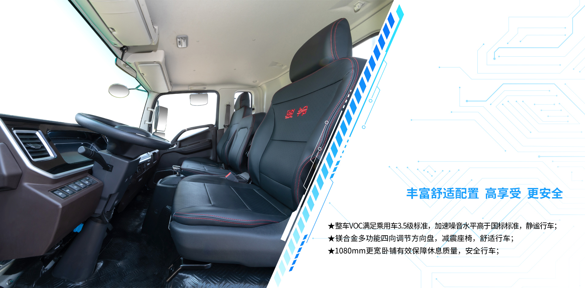 | 基本配置 | DH45、15.55kwh磷酸铁锂电池、驻车空调,电子转向,可翻,气压鼓式,电子驻车,金属漆,电动门窗,中控锁,日间行车灯,电加热后视镜,方向盘(娱乐及巡航按键模块),网联版MP5+倒车影像,LED大灯,自动雨刮,自动大灯,胎压监测,气囊座椅,120L铝合金油箱,铝合金储气筒,铁防护,双电池,备胎,车联网,顶杂物盒,卧铺储物盒(排半标配) | DH45、15.55kwh磷酸铁锂电池、松芝SE410冷机组、驻车空调、电子转向、可翻、气压鼓式、金属漆、电动门窗(一键升降)、中控锁、方向盘(娱乐及巡航按键模块)、日间行车灯、电加热后视镜、网联版MP5+倒车影像、EPB、电子转向、LED大灯、自动大灯、自动雨刮、液晶仪表、胎压监测、气囊座椅、120L铝合金油箱、铝合金储气筒、铁防护、双电池、稳定杆、顶杂物盒、卧铺储物盒(排半标配)、5T/1620后桥、备胎、车联网、钢制副车架 | |
